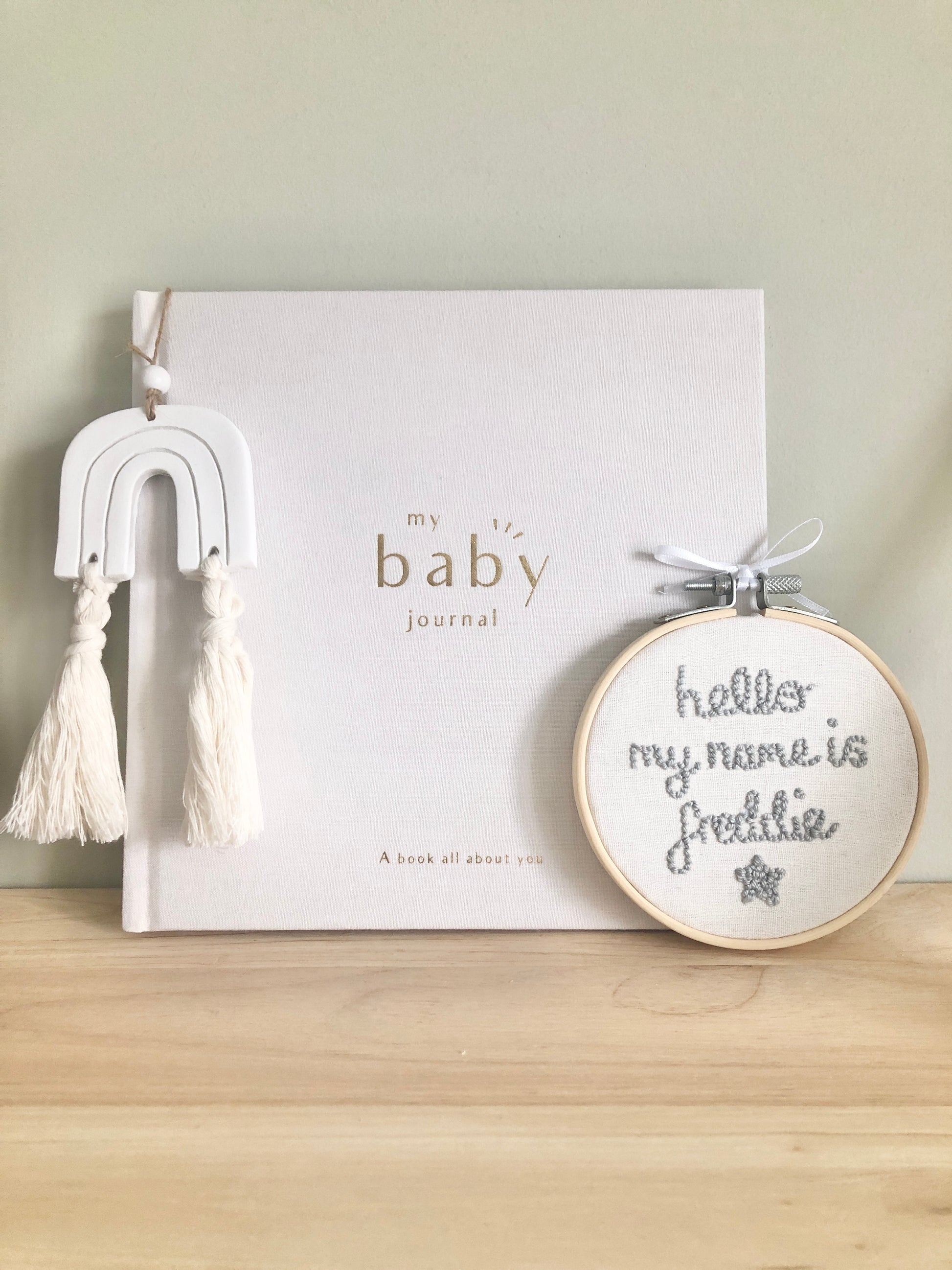 My ‘hello my name is…’ personalised hoops are punched onto your choice of cream, pink or baby blue cotton and linen mix fabric with your choice of yarn colour (see the various options available in the pictures). You can opt for a little star or heart at the bottom (or without either) They are displayed in a bamboo hoop and are available in 4, 5 and 6 inch hoops.