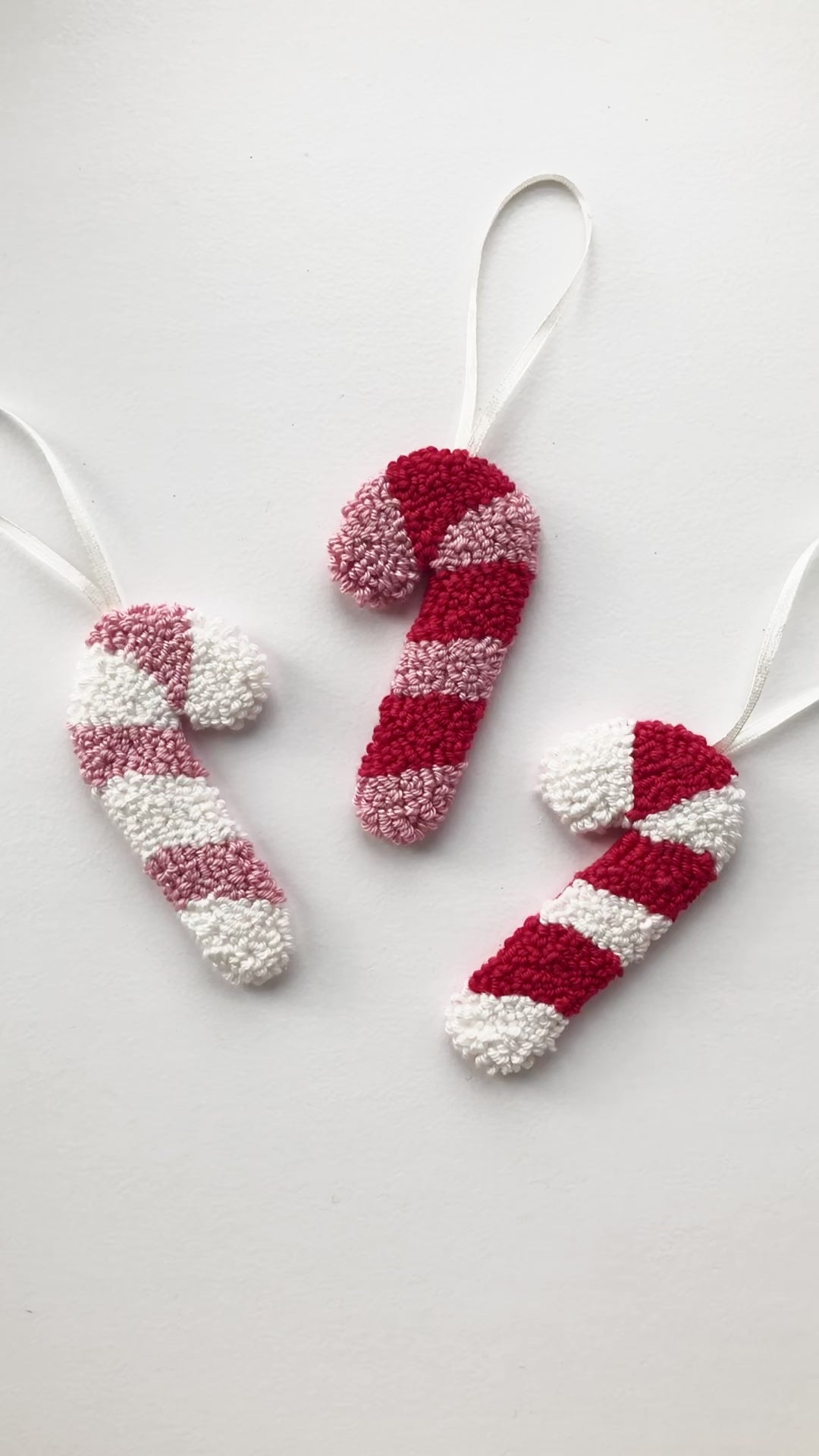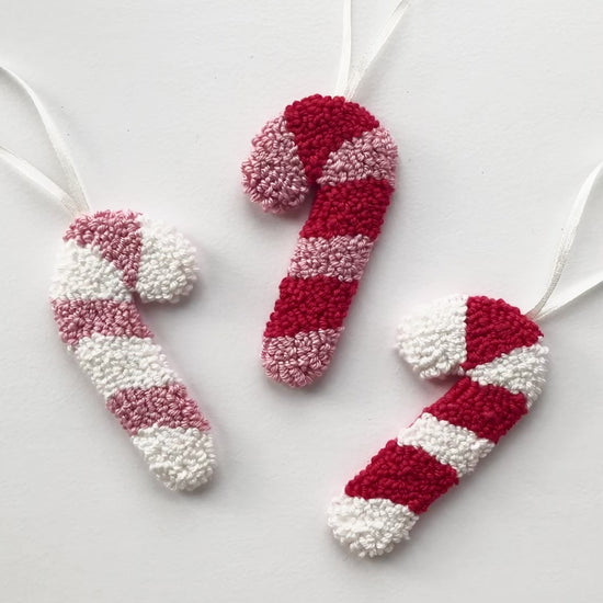 My punch needle candy cane decoration measures approx 10cm by 5cm at their widest point - a lovely size for hanging on your Christmas trees or festive peg rails. You can choose the colours of your candy cane (please leave a note at checkout e.g. red/white, red/pink or pink/white - if no note is left then the colours will be red/white).
