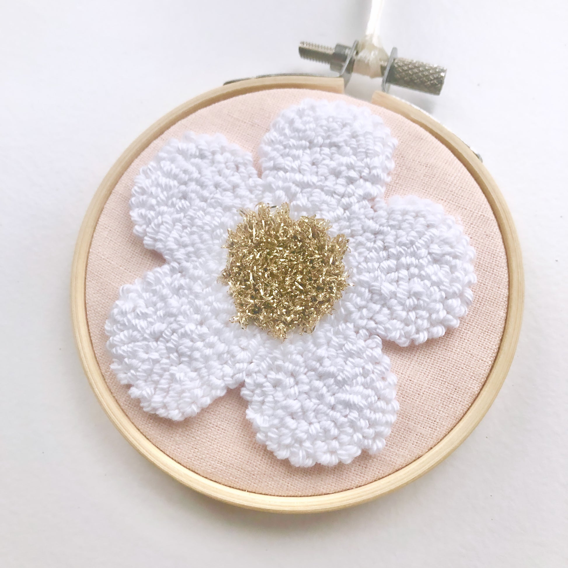 My little flower is punched onto either a pink or cream cotton and linen mix fabric, in your chosen yarn colours and displayed in a bamboo hoop which is approx 3 or 4 inches diameter depending on your selection - both a lovely size for your little ones’ shelfies or peg rails.