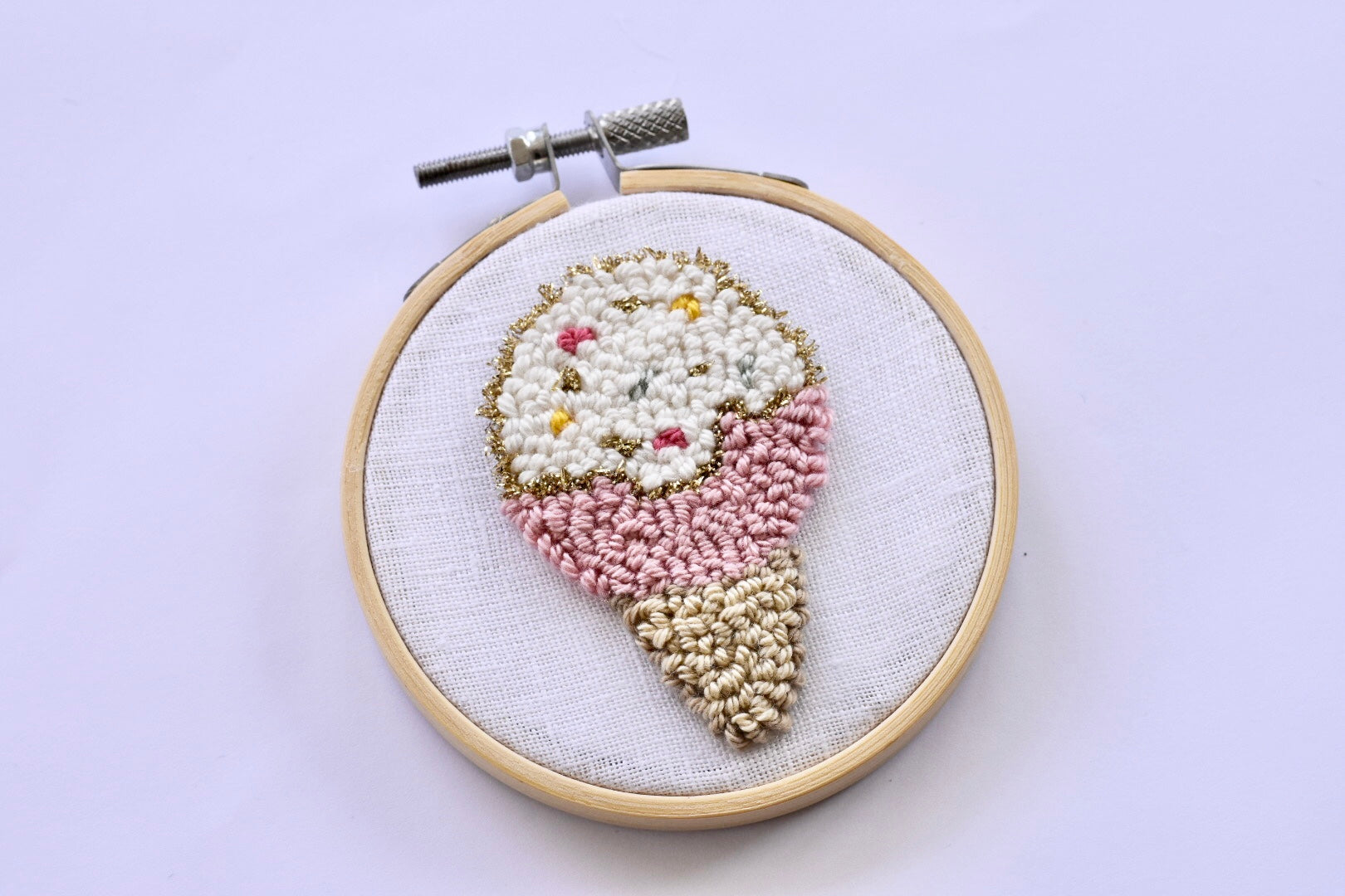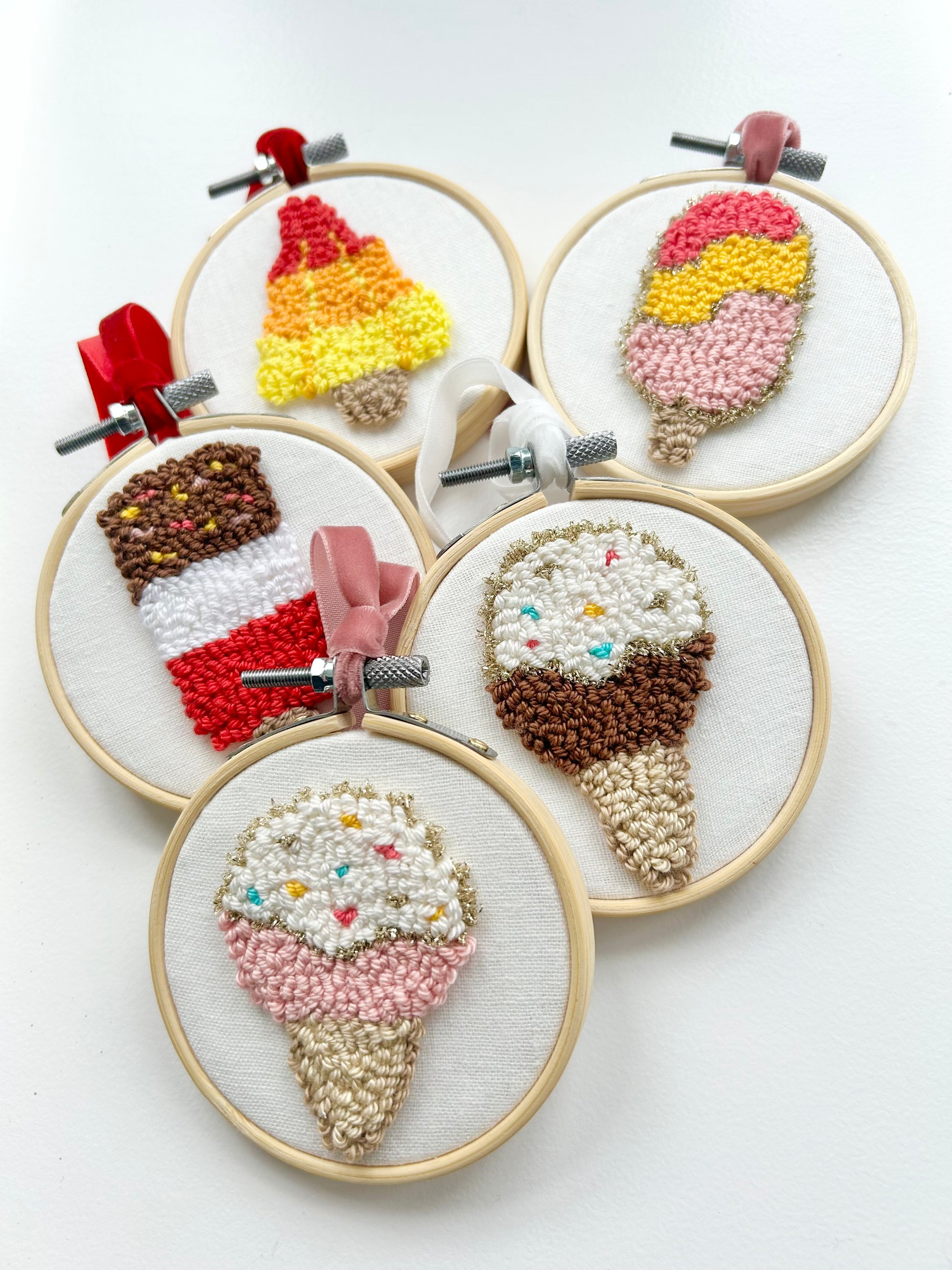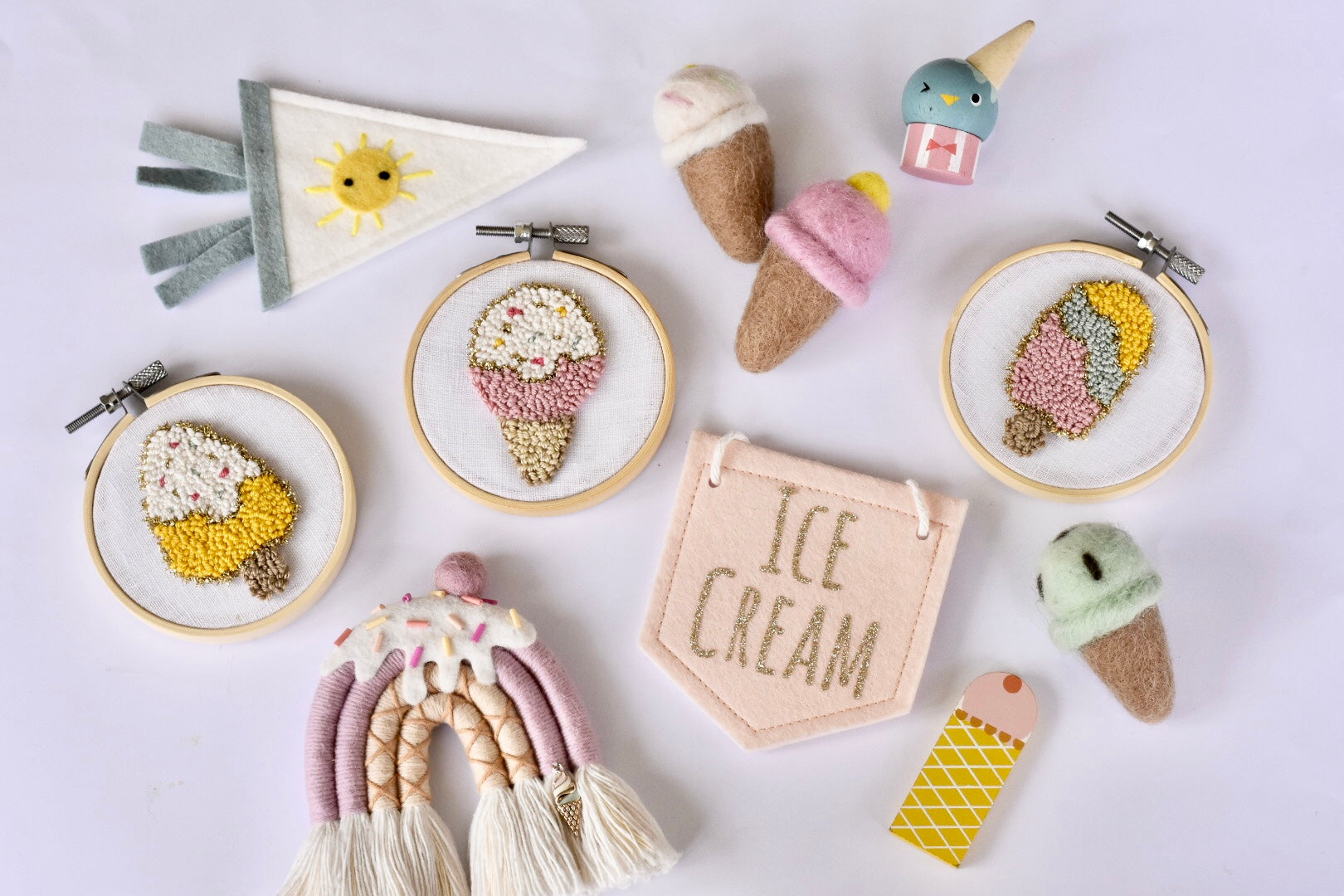 My ice cream decorations are punched onto a cream linen fabric with 100% cotton yarns and sparkly gold thread. They are displayed in a bamboo hoop which is approx 3 inches diameter - a lovely size for hanging on your little one’s shelf or peg rails.