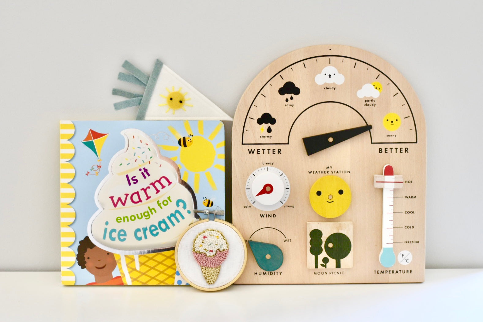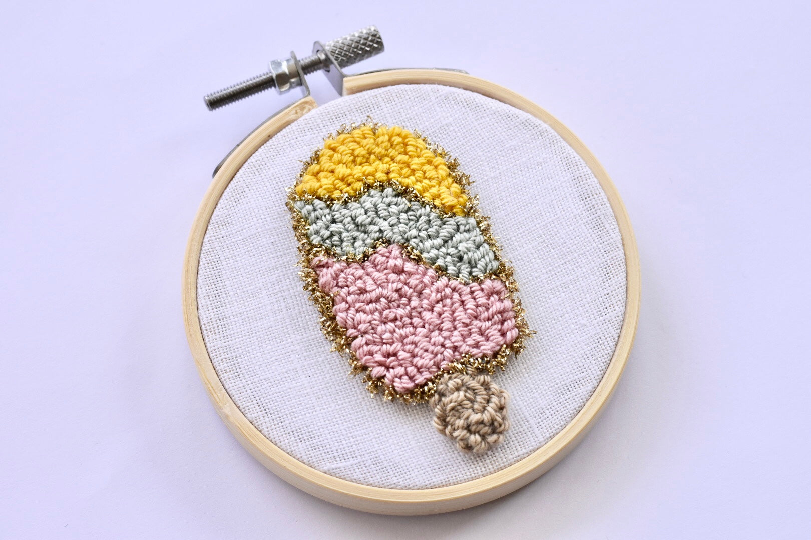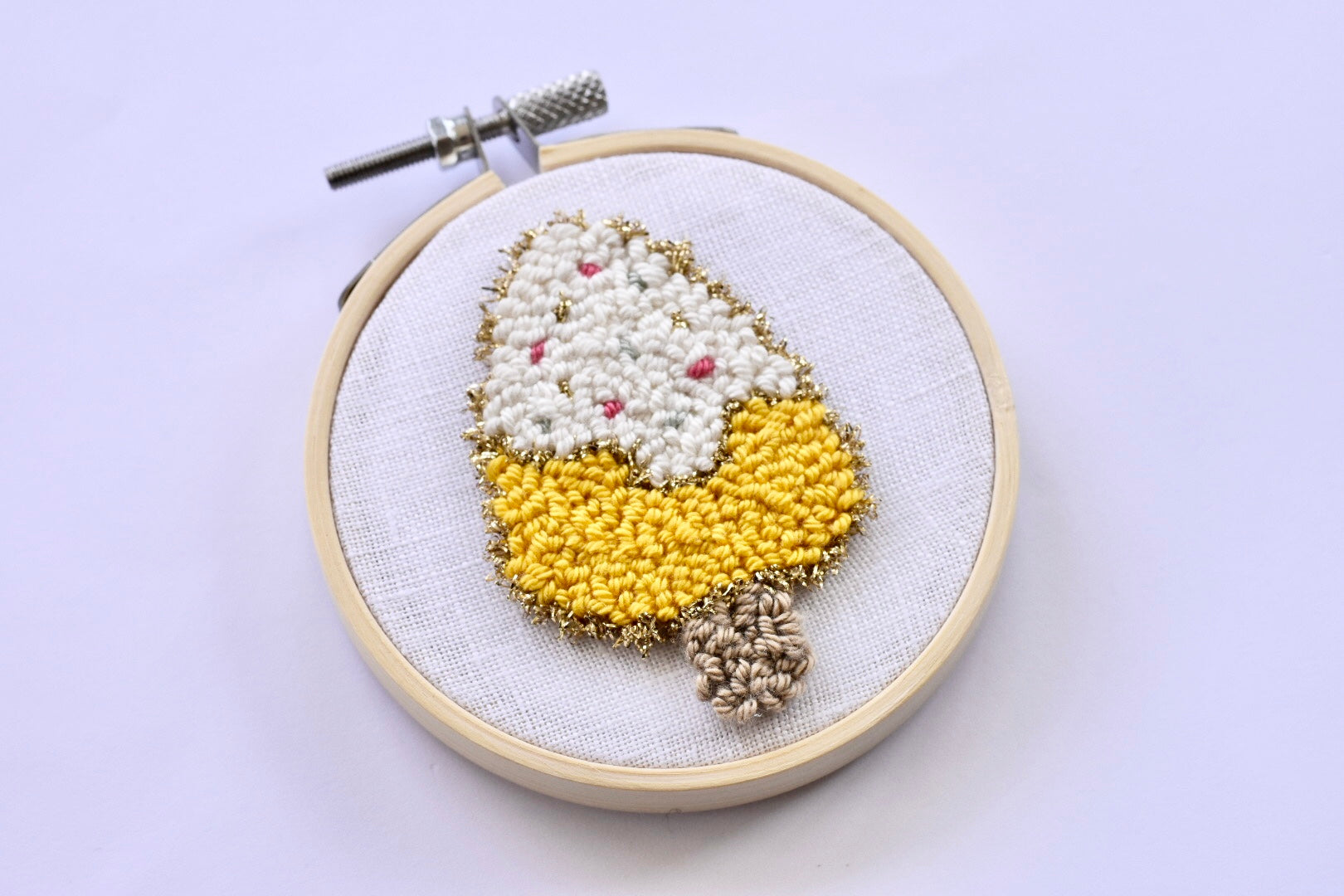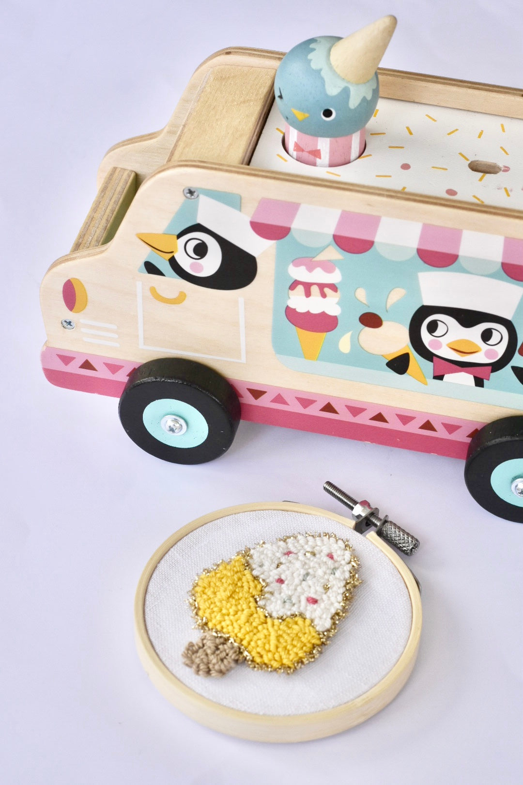 My ice cream decorations are punched onto a cream linen fabric with 100% cotton yarns and sparkly gold thread. They are displayed in a bamboo hoop which is approx 3 inches diameter - a lovely size for hanging on your little one’s shelf or peg rails.