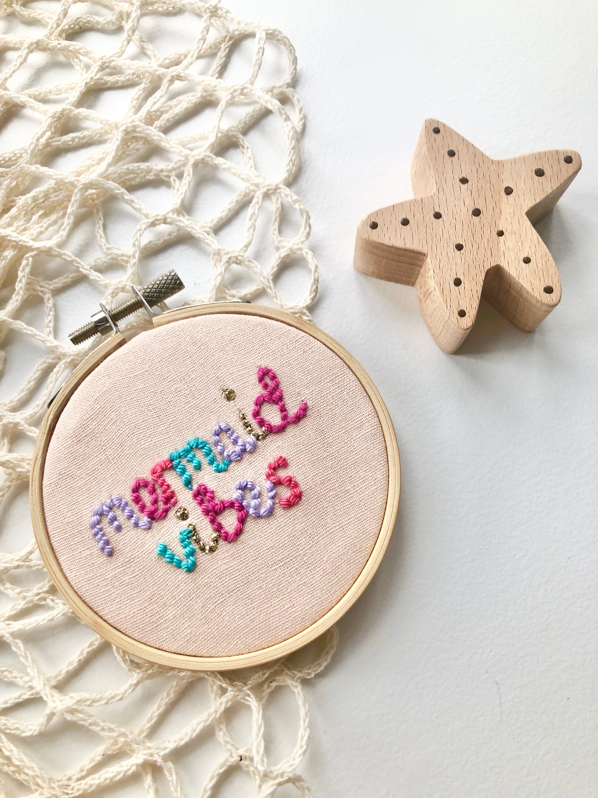 My mermaid vibes decoration is punched onto a light pink linen fabric with lovely bright 100% cotton yarns and sparkly gold thread and displayed in a bamboo hoop which is approx 3 inches diameter - a lovely size for hanging on your little one’s shelf or peg rails.