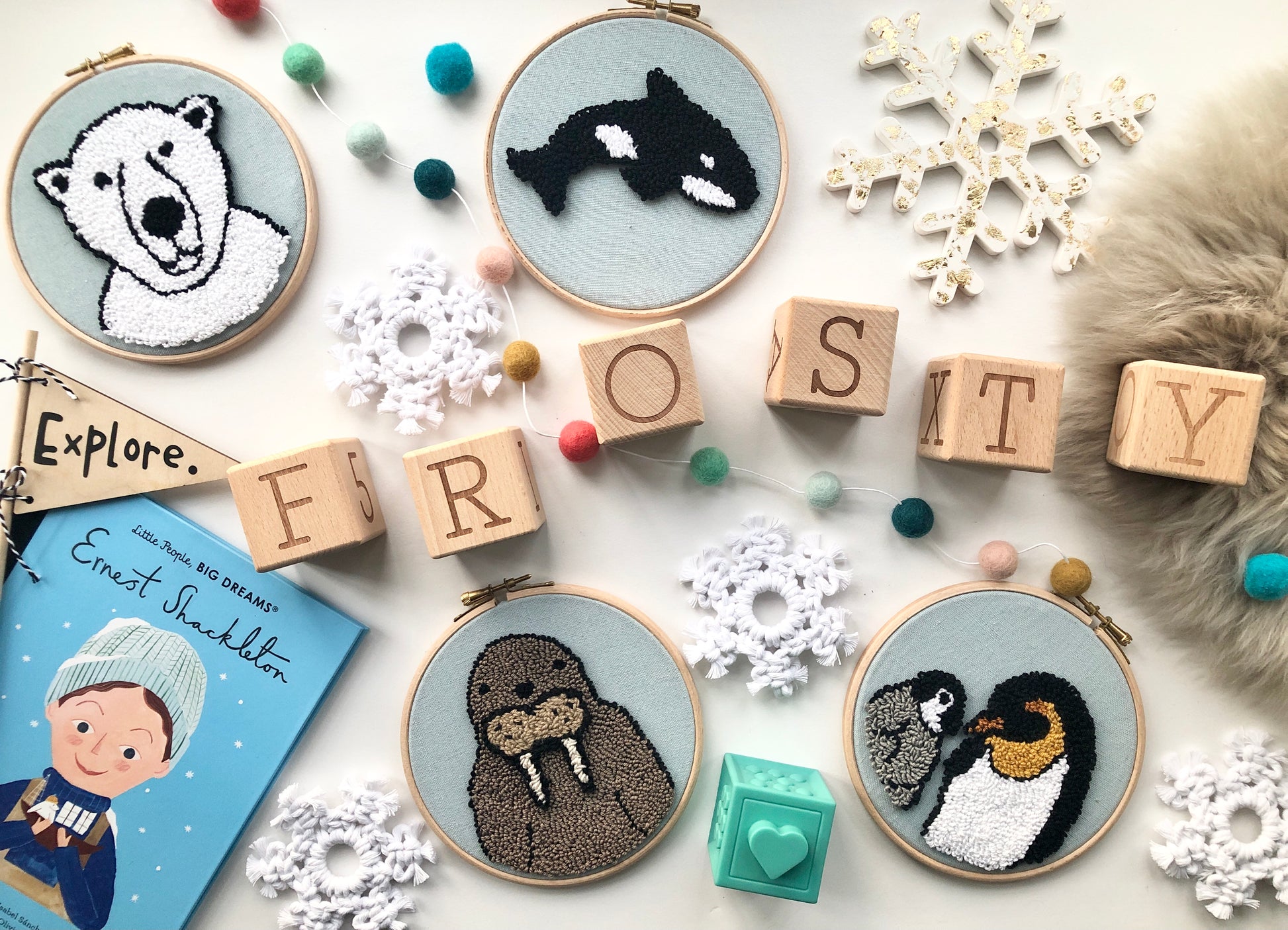 A handmade 6-inch penguin punch needle decoration, featuring an adorable mother and baby penguin in soft, textured detail. Perfect for nursery décor, winter wall art, animal-themed rooms, baby shower gifts, and lovers of cute handmade crafts. Set in a wooden hoop with brass fastening and ready to hang, this charming penguin duo adds warmth and character to any space.