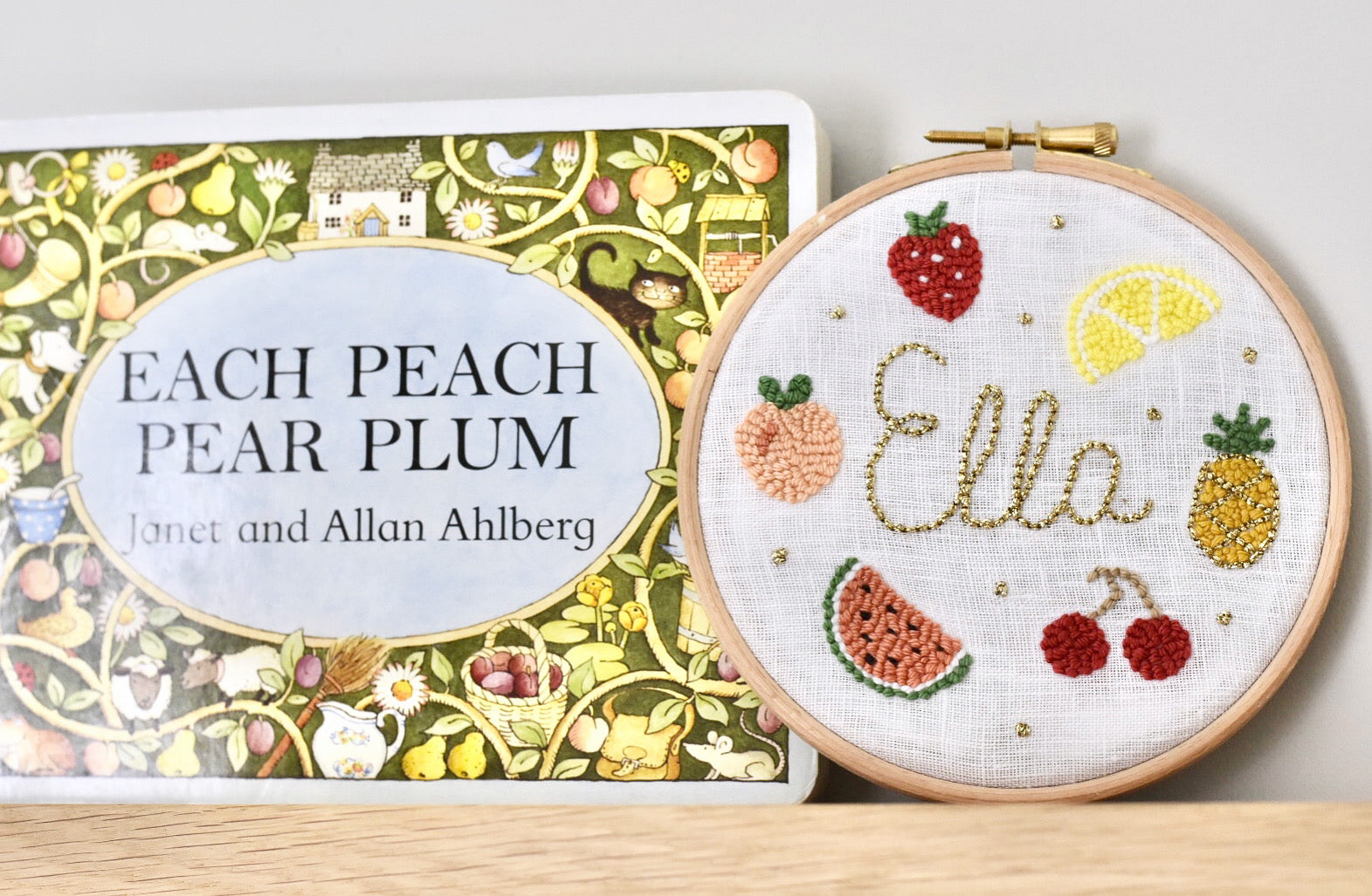 My fruity hoop is punched onto a cream cotton and linen mix fabric using a variety of cotton yarns and is displayed in a bamboo hoop. You can personalise the hoop with your chosen name in your chosen yarn colour (see the colour chart in the pictures). You can choose either a 5, 6, 7 or 8 inch hoop. Please add a note at checkout confirming your chosen name and yarn colour (e.g. Ella in gold).