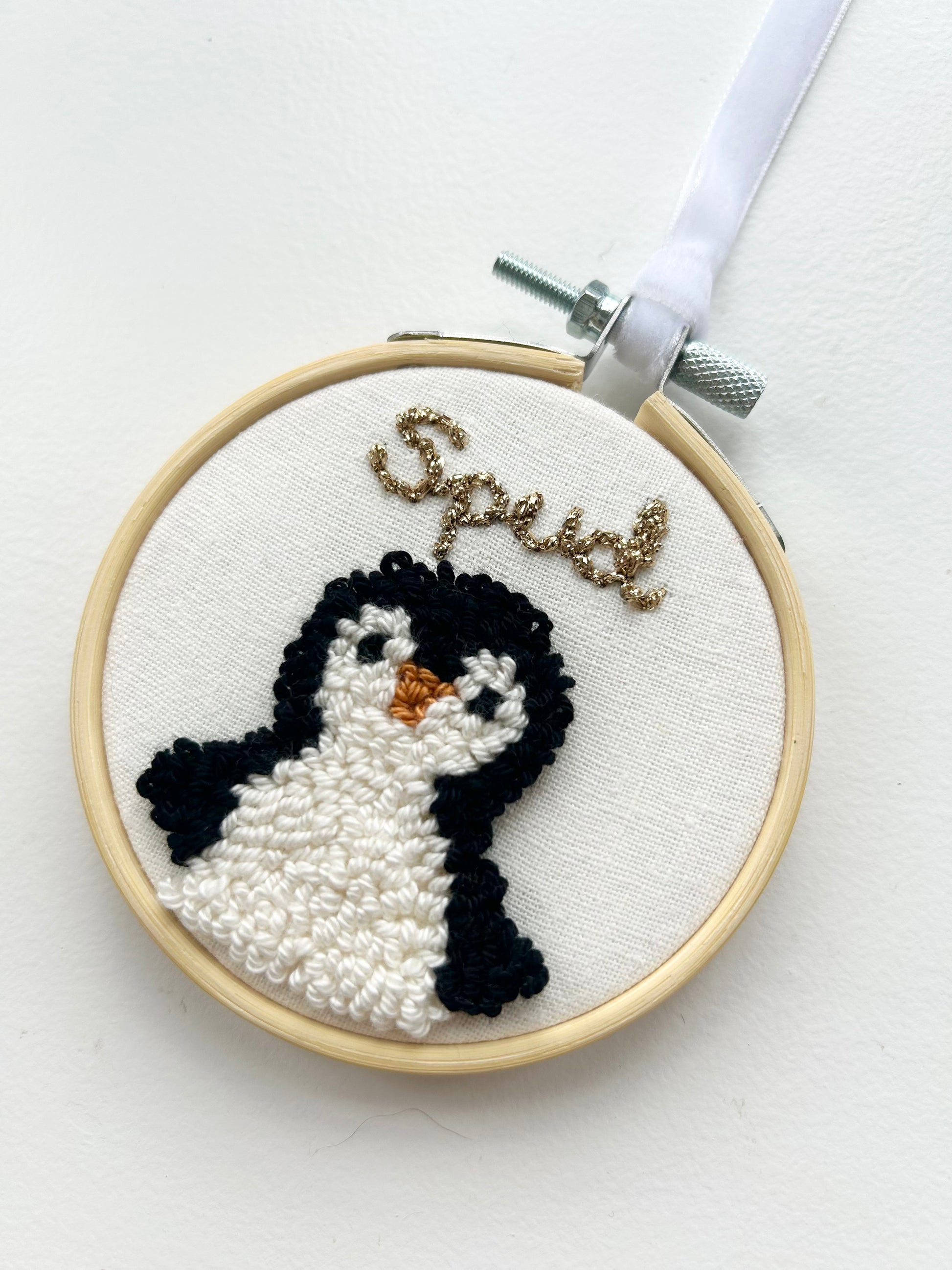 You can personalise this cute little penguin decoration with your chosen name in either sparkly gold or red thread (please leave a note of checkout with your name). I will punch it onto a cream linen fabric and display it in a bamboo hoop approx 3 inches diameter - a lovely size for hanging on your Christmas trees or festive peg rails.