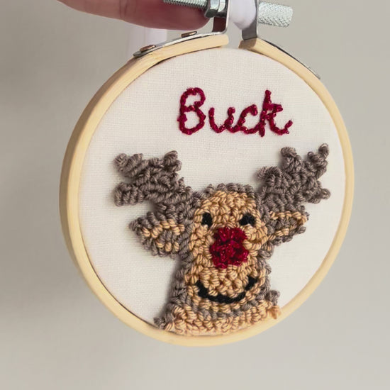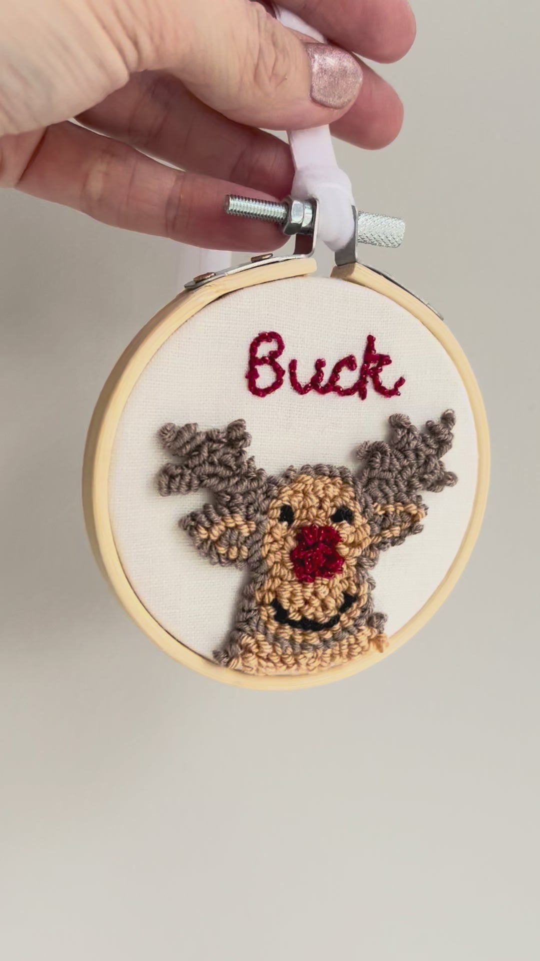 You can personalise this cute little Rudolph decoration with your chosen name in either sparkly gold or red thread (please leave a note of checkout with your name). I will punch it onto a cream linen fabric and display it in a bamboo hoop approx 3 inches diameter - a lovely size for hanging on your Christmas trees or festive peg rails.