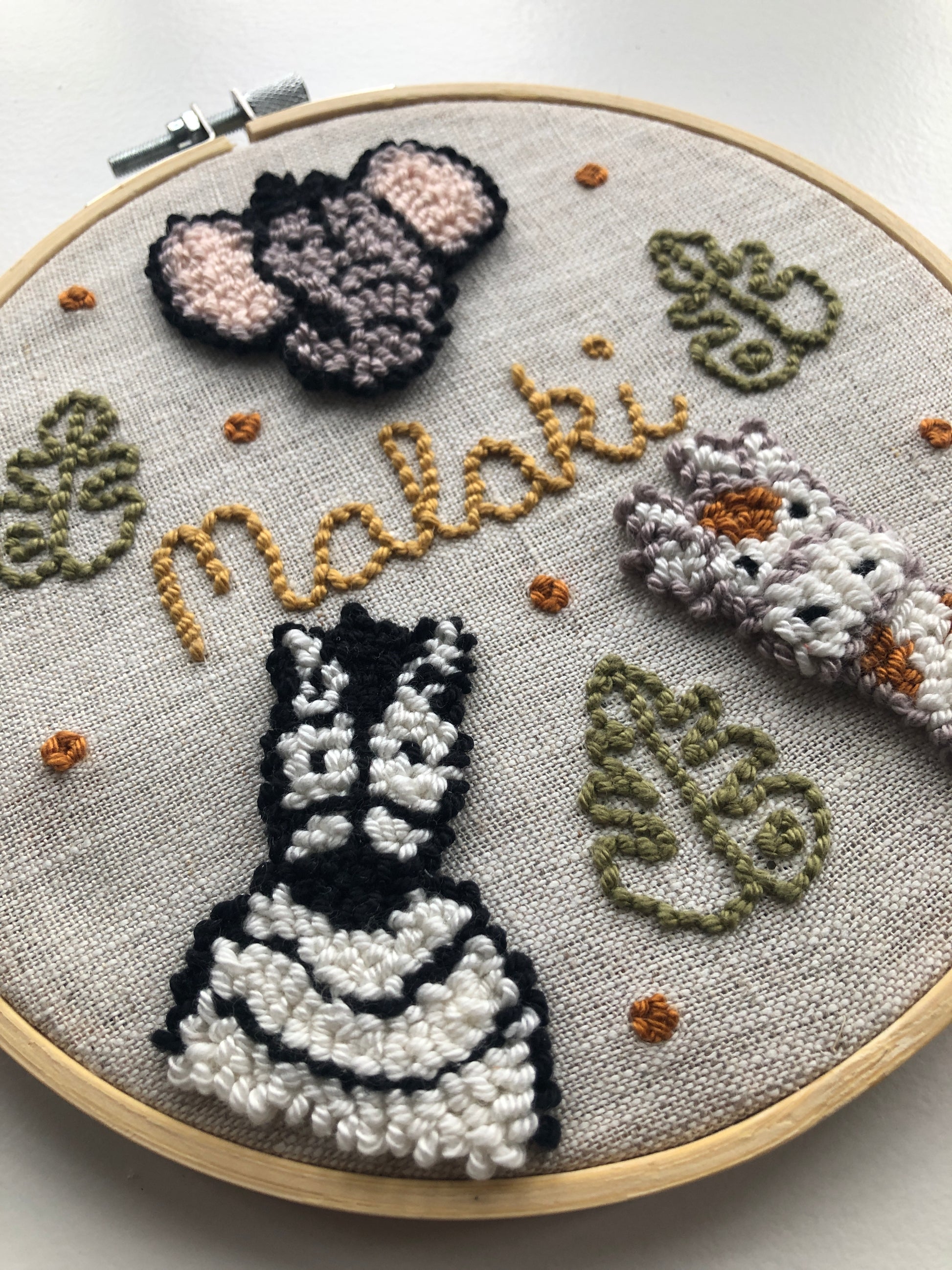 My safari animal hoop is punched onto a natural coloured cotton and linen mix fabric using cotton yarns and displayed in a bamboo hoop. You can choose either a 5, 6, 7 or 8 inch hoop. The hoop will be personalised with your chosen name in your choice of colour (see the colour chart in the pictures), please add a note at checkout confirming your chosen name and yarn colour.