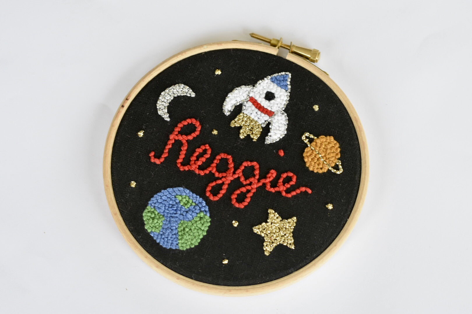 My personalised space hoop is punched onto a black cotton and linen mix fabric using a variety of cotton yarns and is displayed in a bamboo hoop. You can personalise the hoop with your chosen name in your chosen yarn colour (see the colour chart in the pictures). You can choose either a 5, 6, 7 or 8 inch hoop. Please add a note at checkout confirming your chosen name and yarn colour (e.g. Reggie in red).