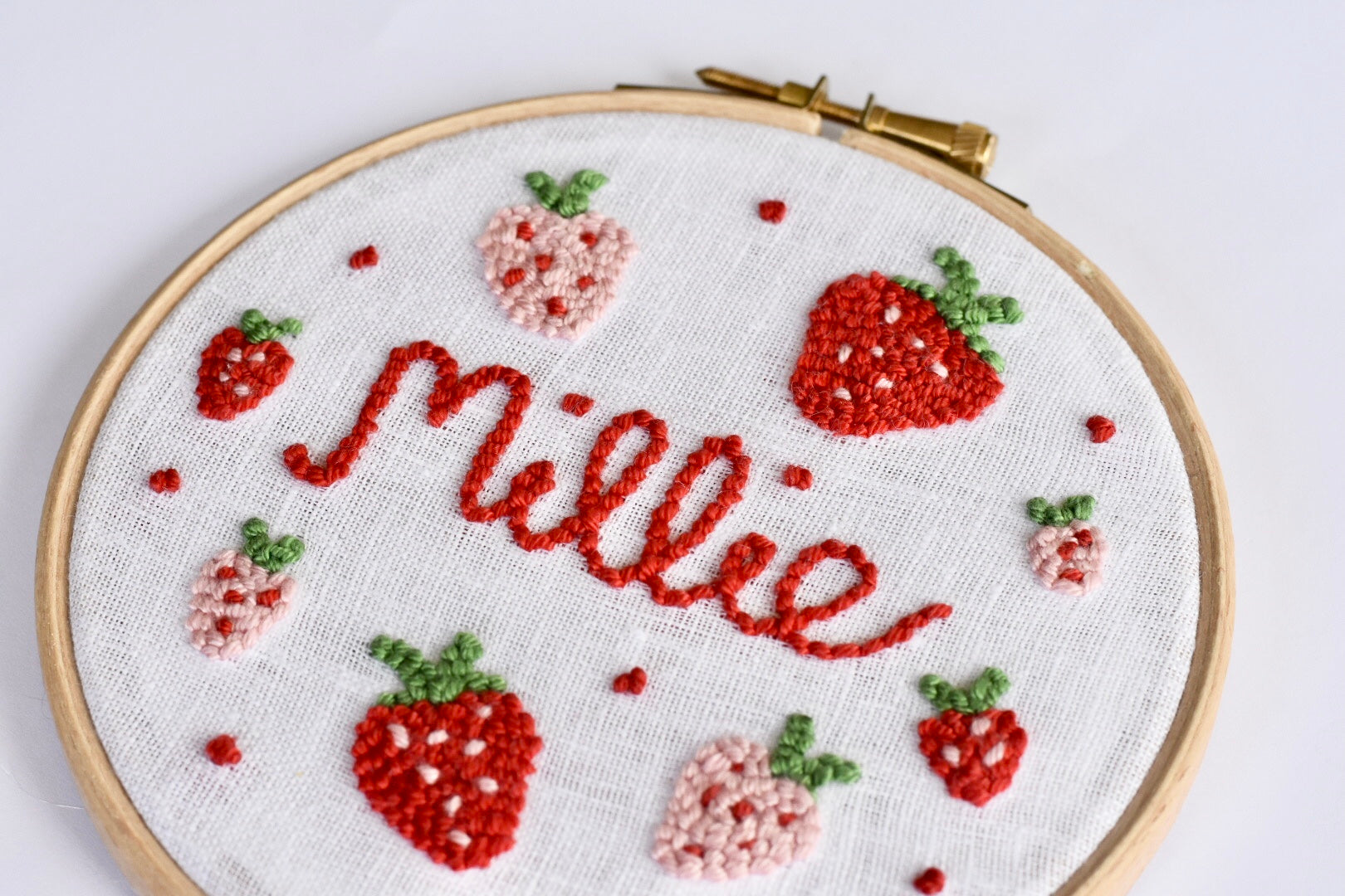 My strawberry hoop is punched onto a cream cotton and linen mix fabric using a variety of cotton yarns and is displayed in a bamboo hoop. You can personalise the hoop with your chosen name in your chosen yarn colour (see the colour chart in the pictures). You can choose either a 5, 6, 7 or 8 inch hoop. Please add a note at checkout confirming your chosen name and yarn colour (e.g. Ella in gold).
