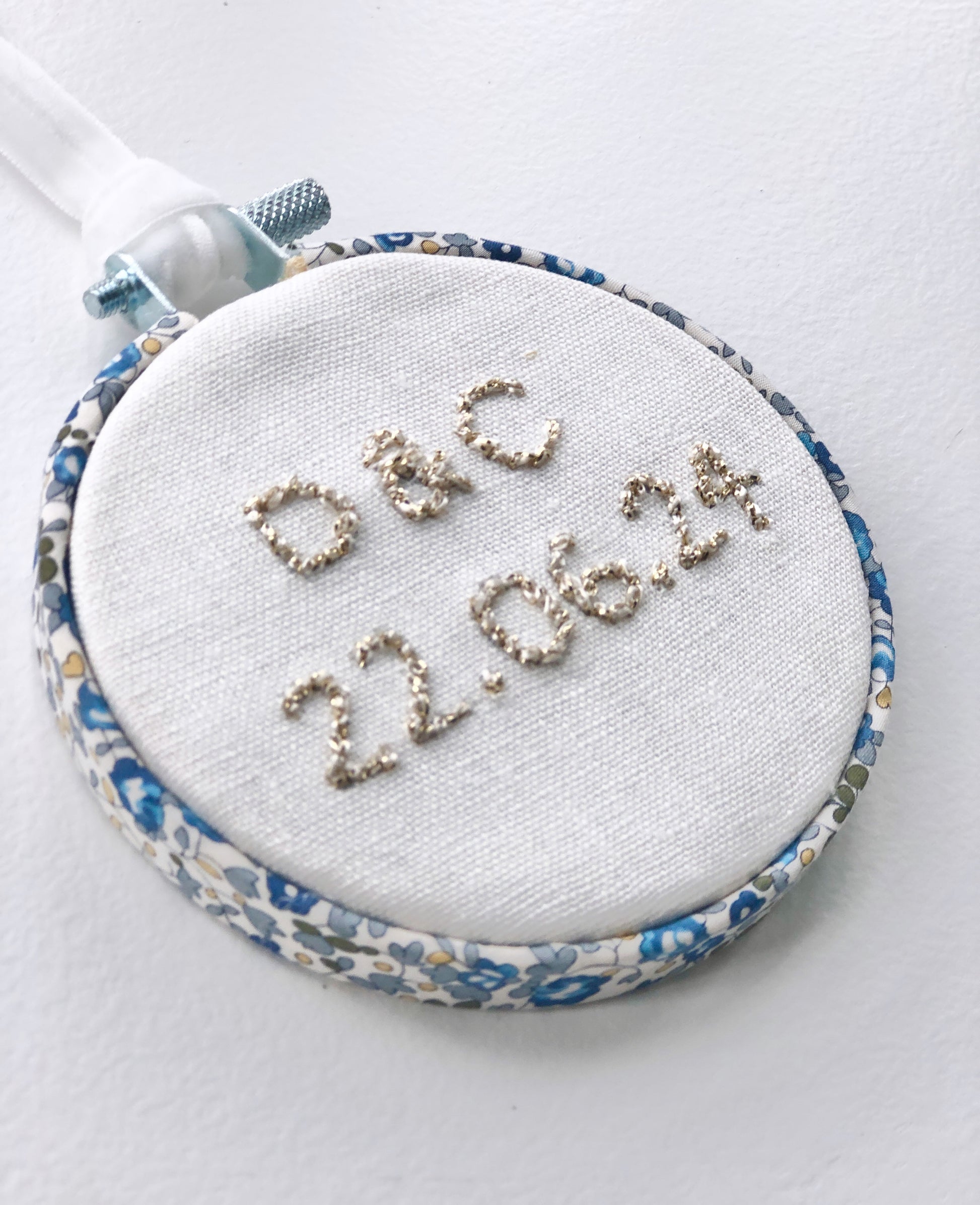 My personalised wedding hoops are punched onto your choice of cream, pink or baby blue cotton and linen mix fabric with your choice of yarn colour (see the various options available in the pictures). They are displayed in a bamboo hoop and you can choose to have it wrapped in your choice of one of my Liberty fabrics. They are available in 3, 4, 5 and 6 inch hoops and make the perfect wedding keepsake or gift.
