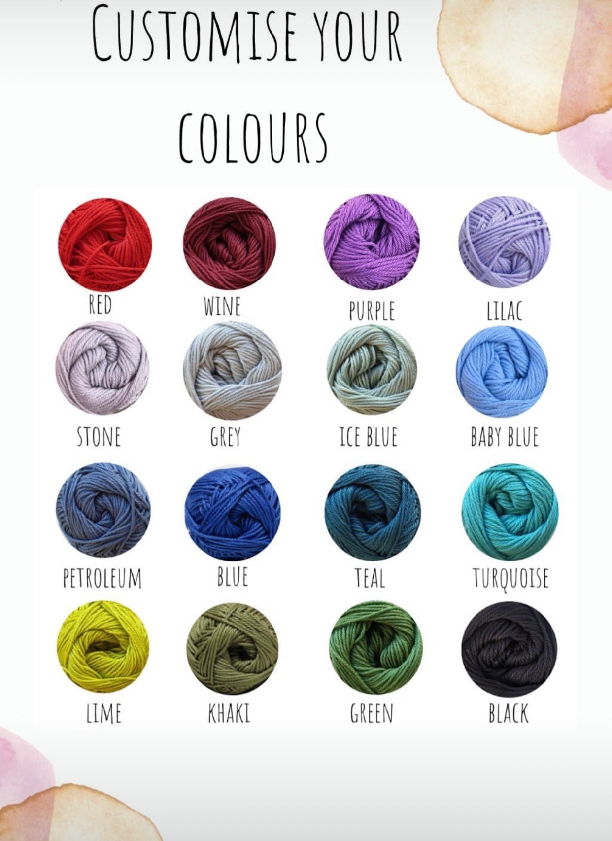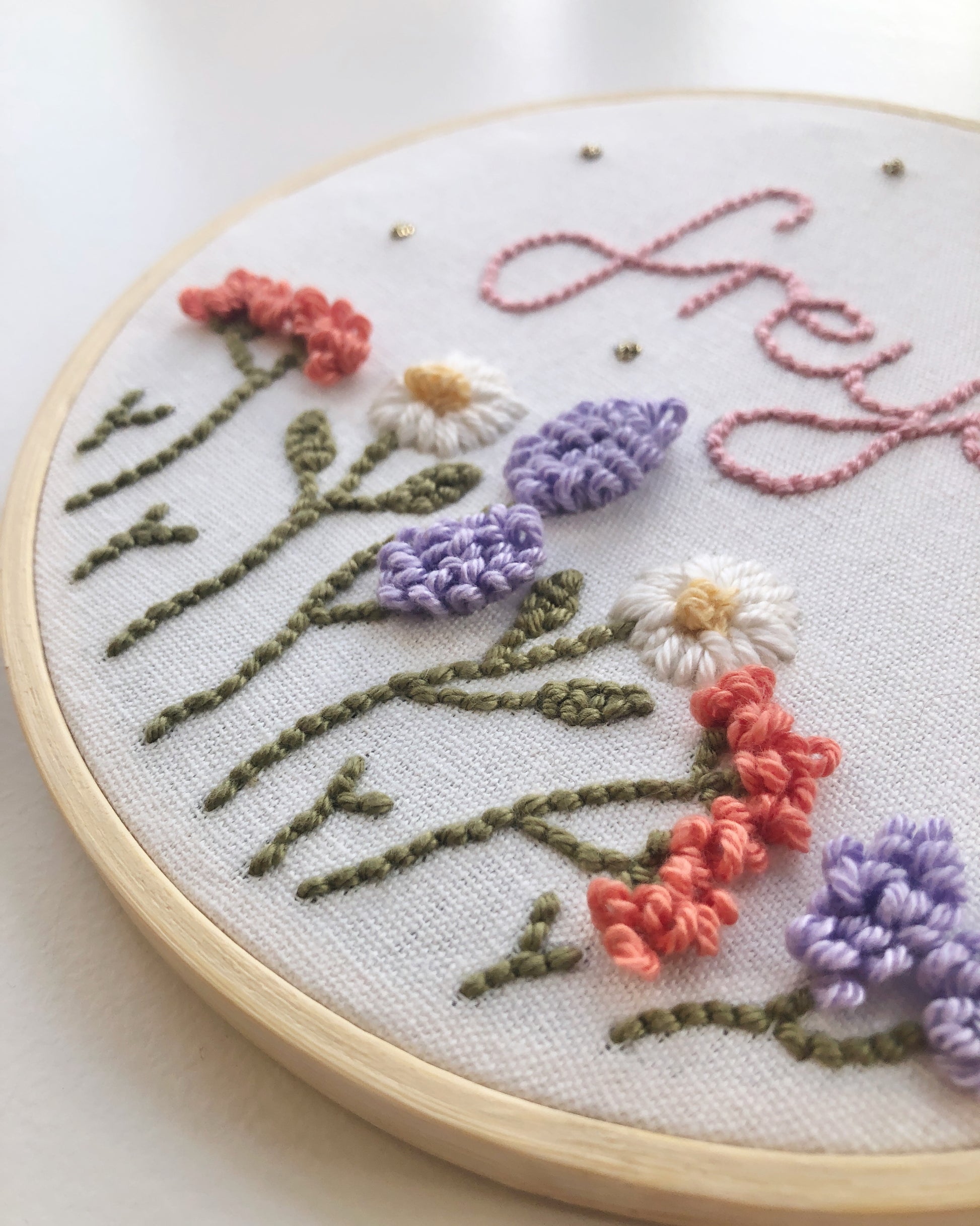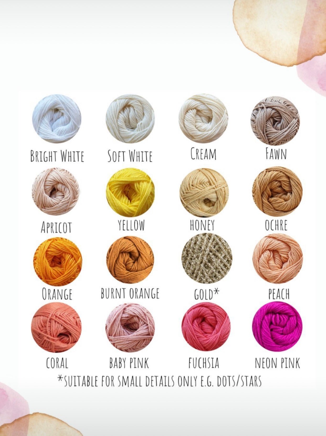 My wildflower hoop is punched onto a cream cotton and linen mix fabric using a variety of cotton yarns. You can choose the ‘she is a wildflower’ wording or alternatively it can be personalised with your chosen name in your chosen yarn colour (see the colour chart in the pictures) and it is displayed in a bamboo hoop. You can choose either a 5, 6, 7 or 8 inch hoop. Please add a note at checkout confirming your chosen wording and yarn colour (e.g. ‘she is a wildflower’ in gold or ‘Freya’ in baby pink).