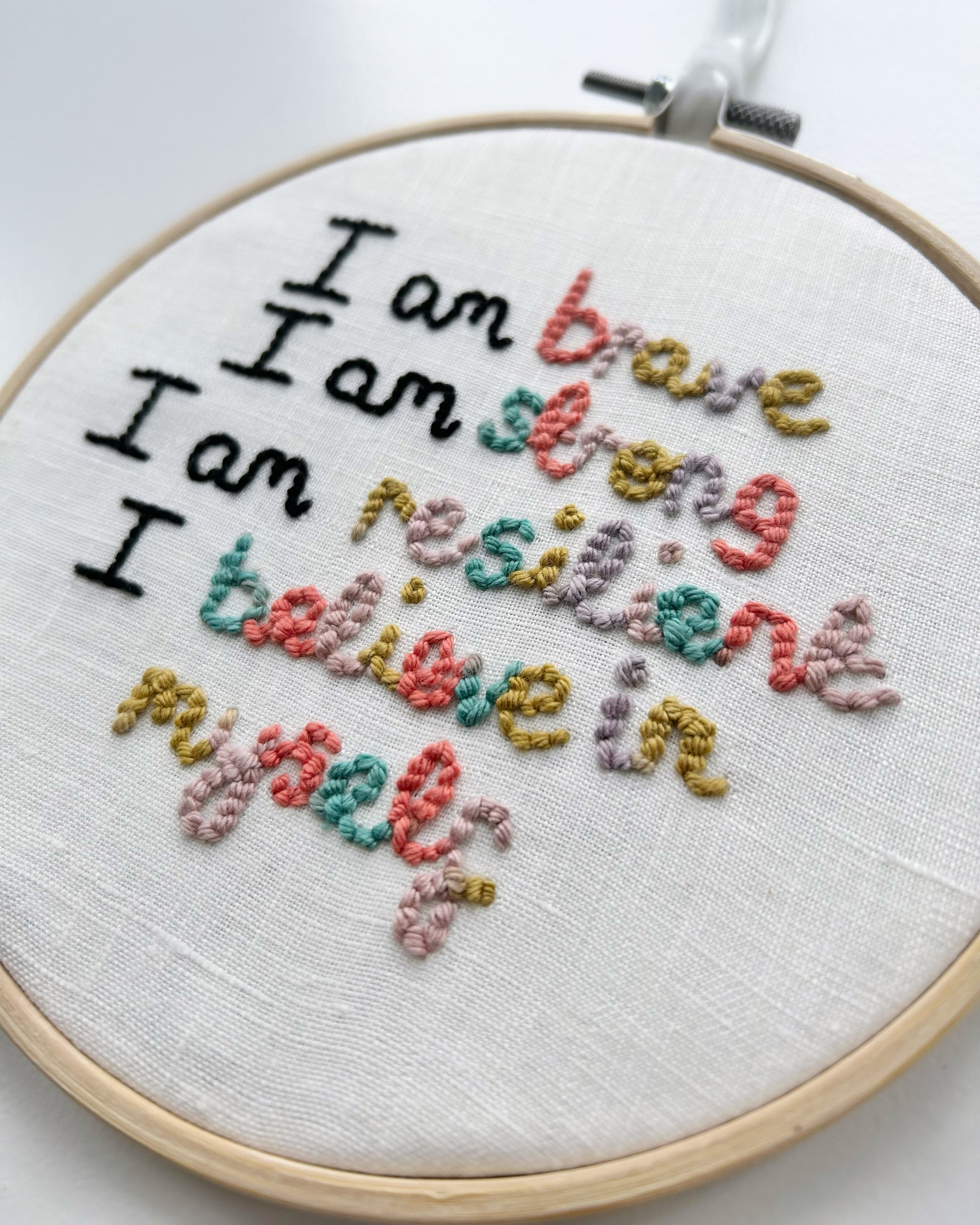 My positive affirmation hoop is punched onto a cream cotton and linen mix fabric using a variety of cotton yarns and displayed in a bamboo hoop. You can substitute the words “brave”, “strong”, “resilient” and “believe in myself” on the hoop with your chosen words in your chosen yarn colour (see the colour chart in the pictures - the rainbow yarn is used on the example shown). You can choose either a 6, 7 or 8 inch hoop. Please add a note at checkout confirming your chosen words and yarn colour.