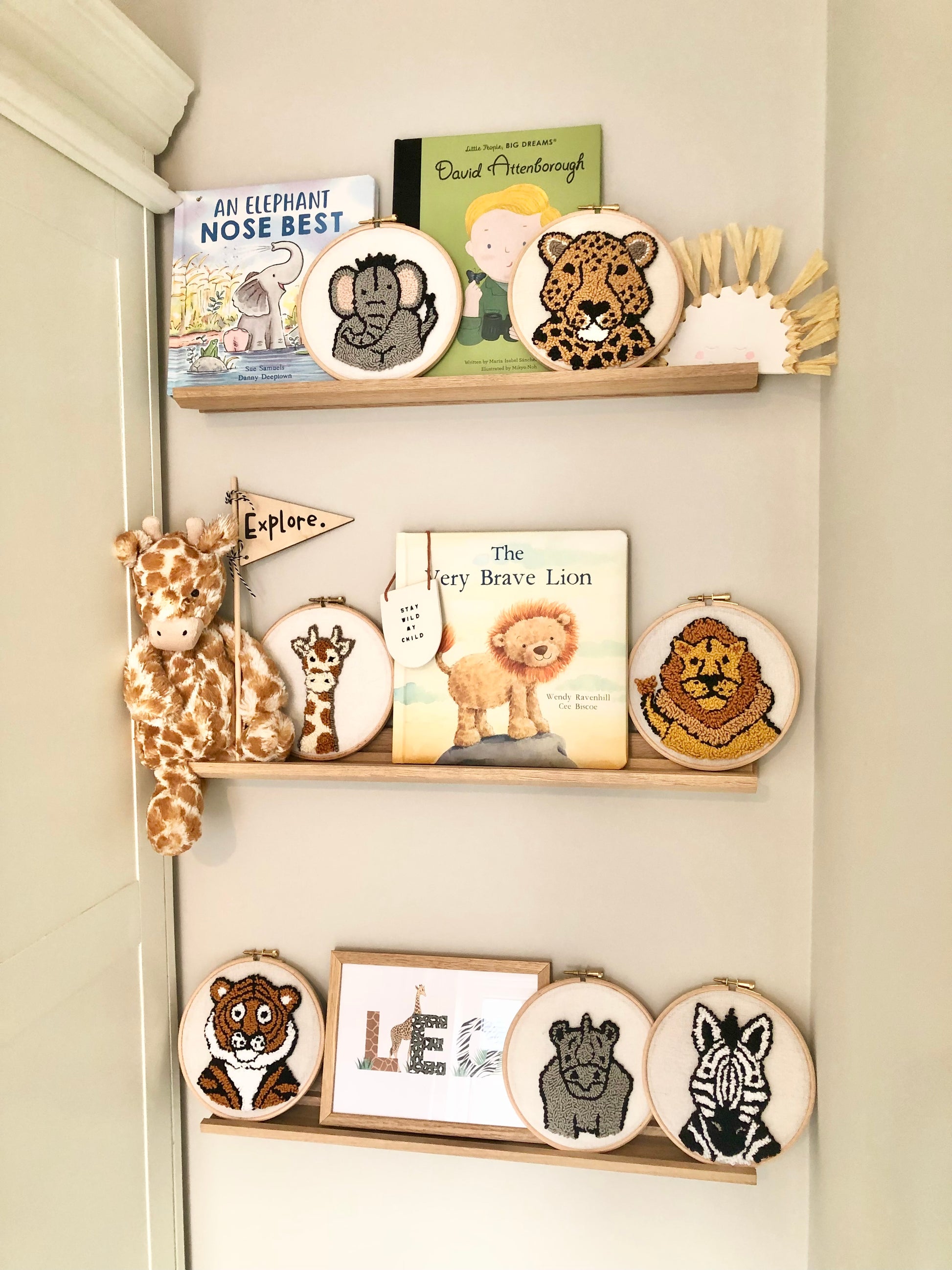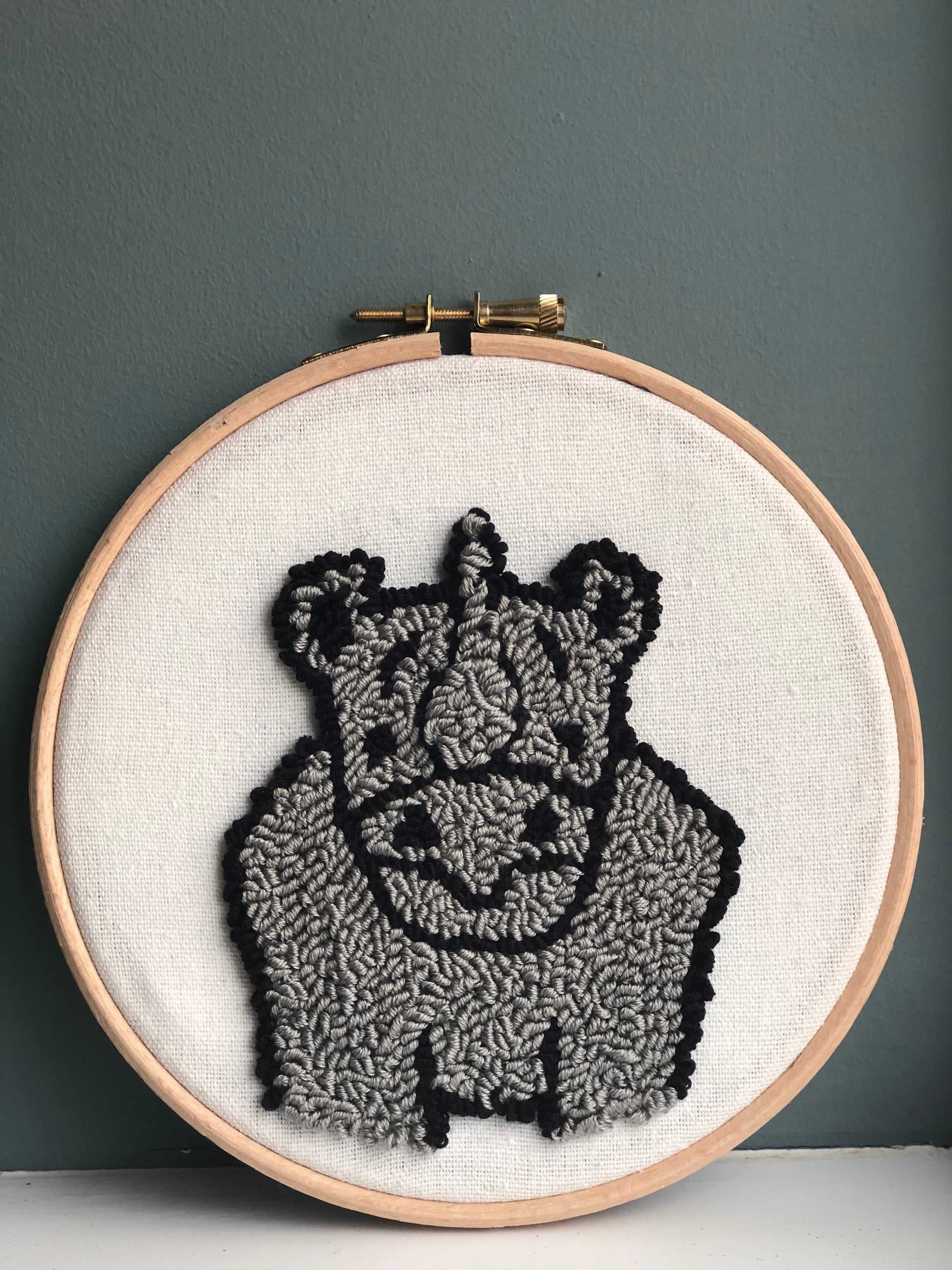 Bring the wild indoors with this 6-inch Rhino Punch Needle Decoration. Handcrafted with my punch needle onto a natural coloured background, t’s perfect for safari-themed nurseries, adding charm and texture to shelves, walls, or desks. Makes a unique gift for little animal lovers.