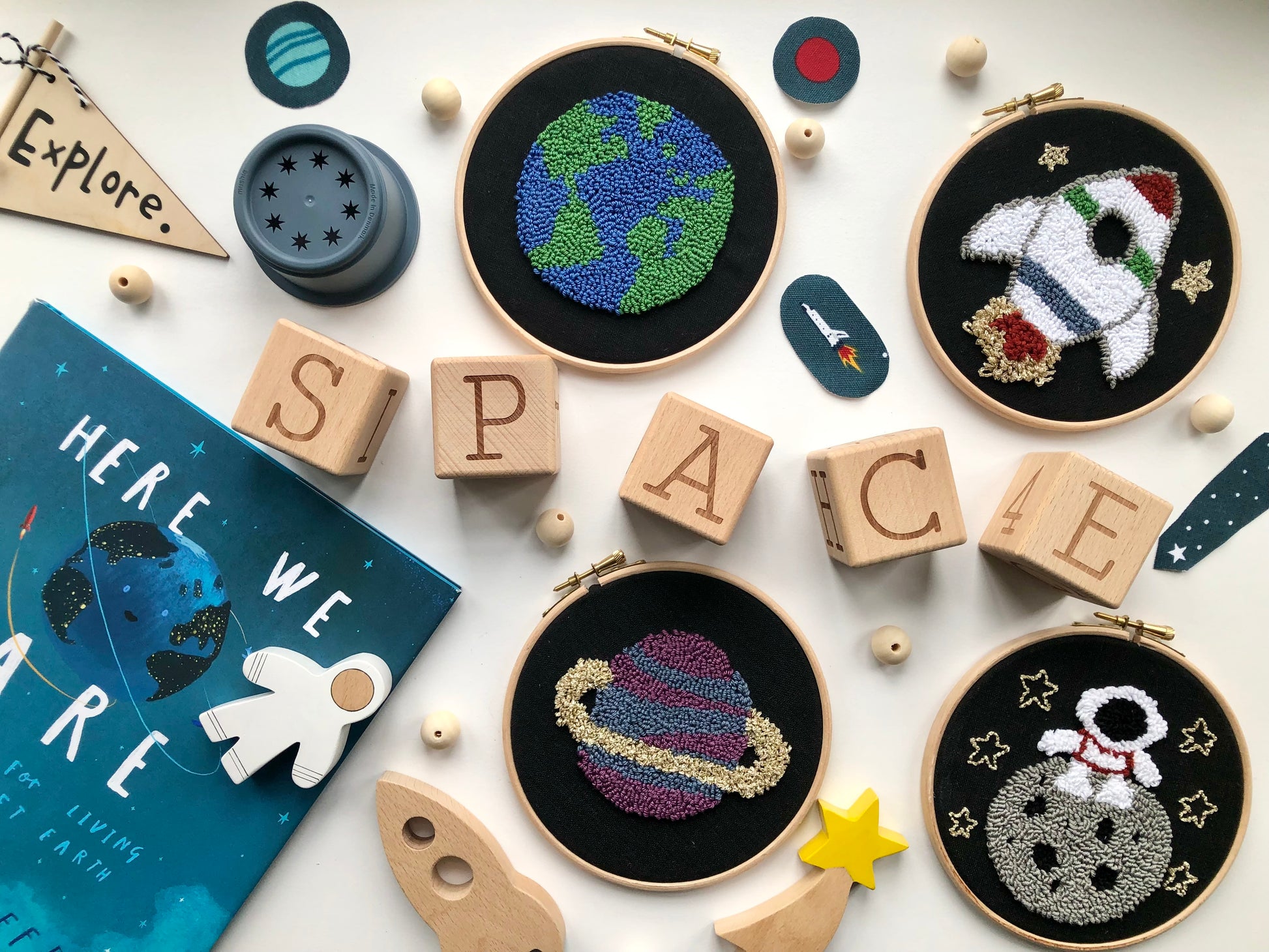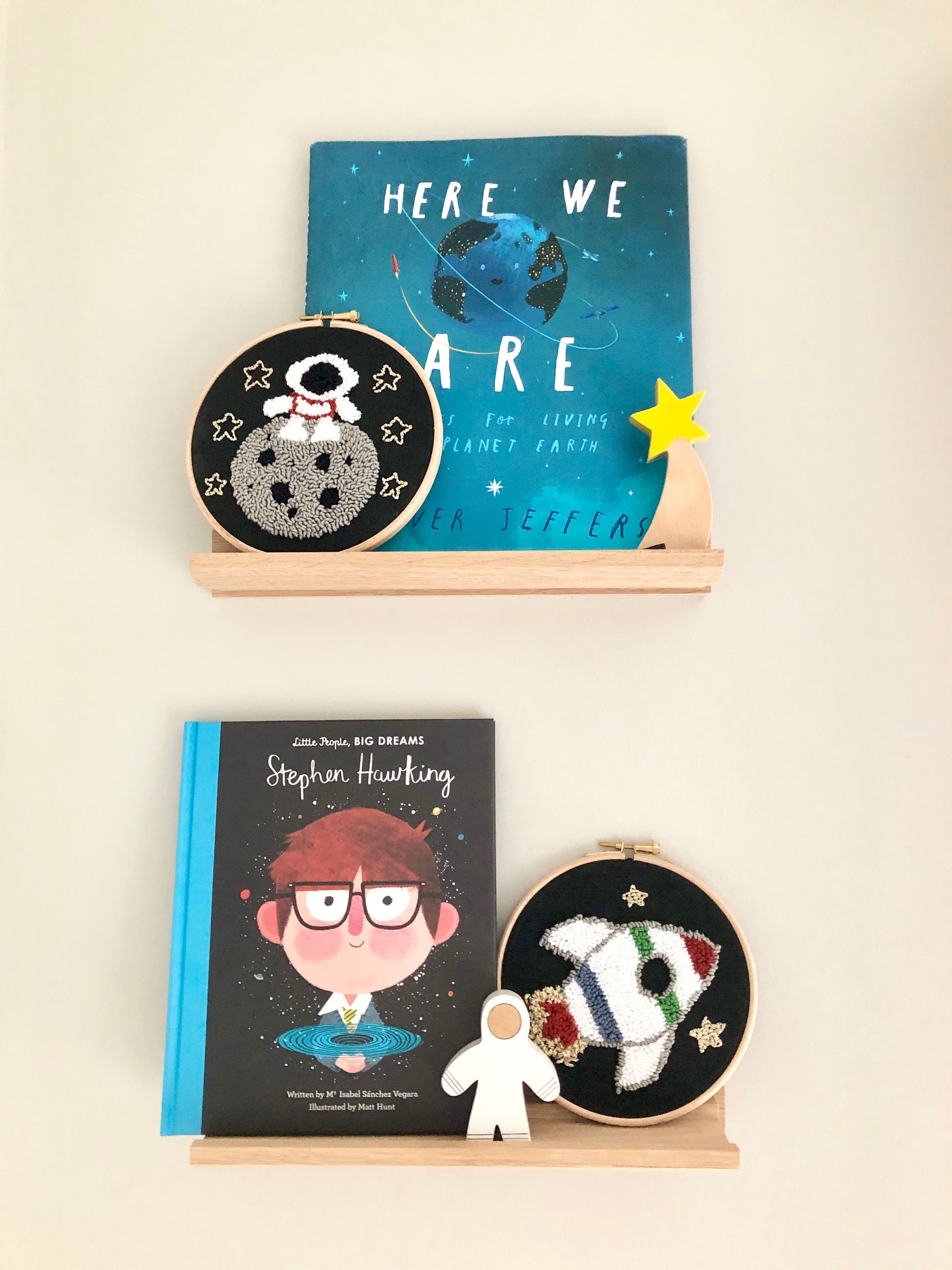 Add a touch of cosmic charm to your space with this handmade 6-inch rocket punch needle decoration. Featuring a striped white rocket with golden flame and stars on a black backdrop, this unique wall art is perfect for space-themed décor, nurseries, kids’ rooms, and astronomy lovers. Crafted with high-100% cotton yarn in a natural wooden hoop with brass fastening, it arrives ready to hang—an ideal handmade gift for space enthusiasts.