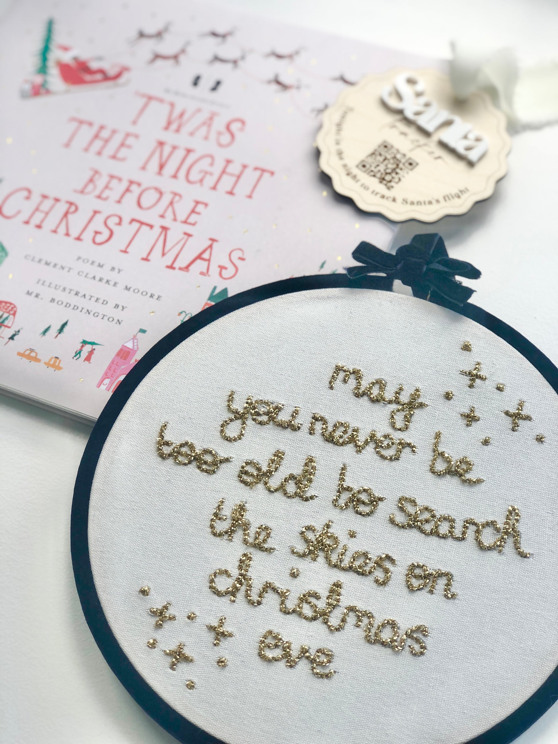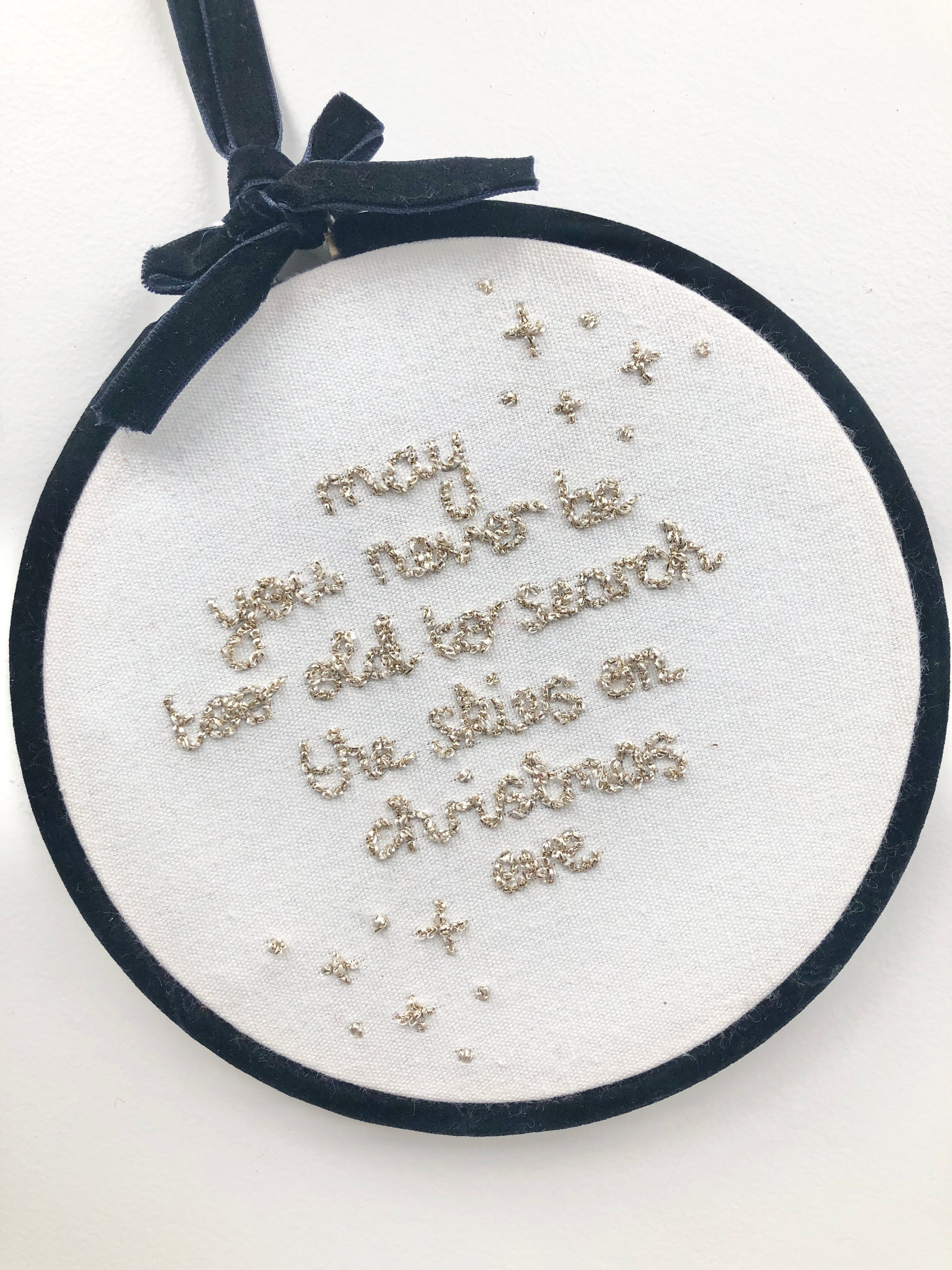 My search the skies hoop is punched onto a cream cotton and linen mix fabric using a sparkly gold thread and displayed in a bamboo hoop wrapped in a luxurious deep navy velvet. You can choose either a 6, 7 or 8 inch hoop.