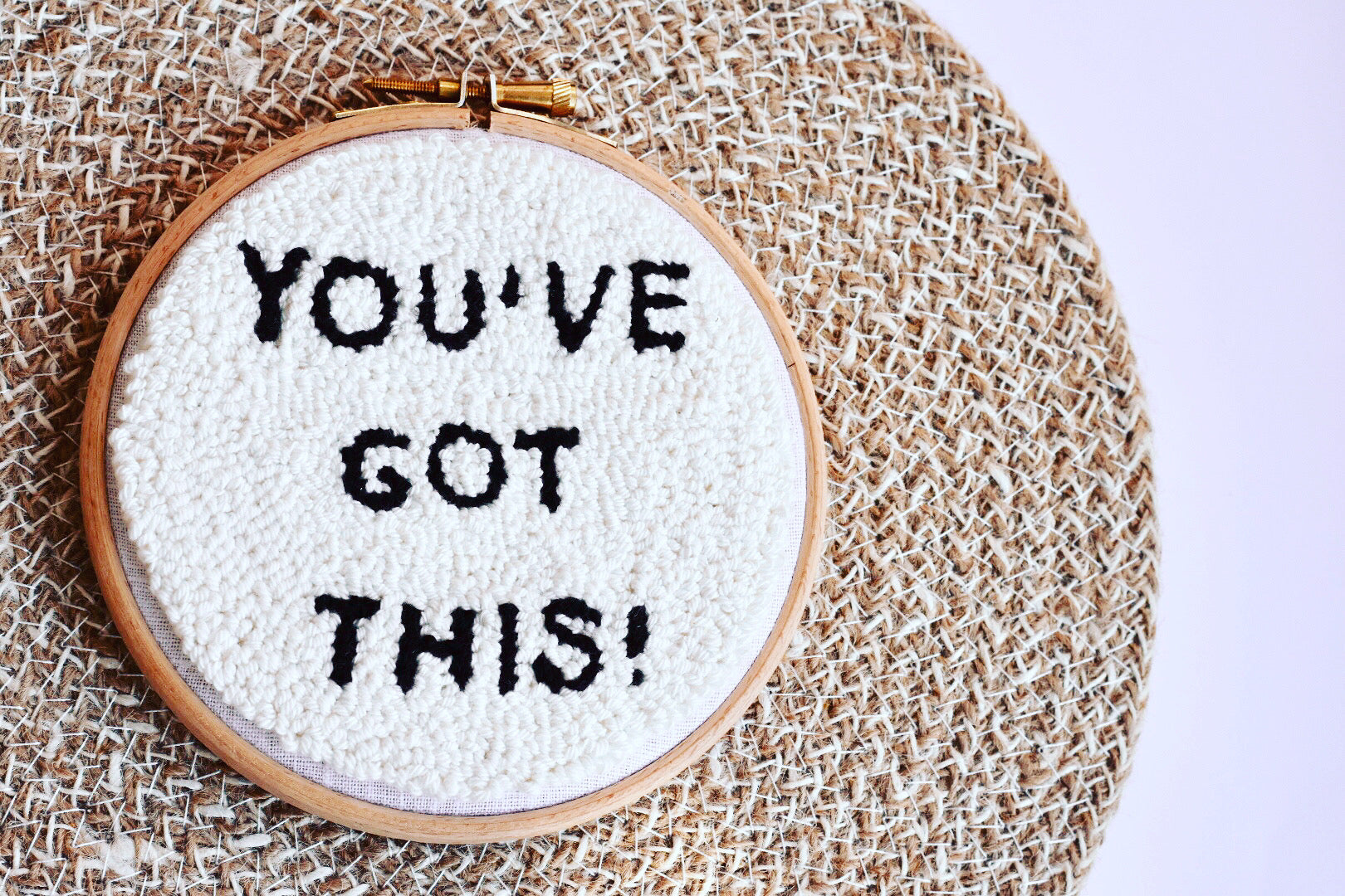 Boost any space with this uplifting 5-inch motivational punch needle decoration featuring the positive message “you’ve got this!”. Handmade using my punch needle and displayed in a wooden hoop with brass fastening, it’s perfect for office décor, student gifts, self-care spaces and inspirational home décor. Ready to hang and full of encouragement, this handmade piece makes a thoughtful mindfulness gift or daily reminder to stay motivated.